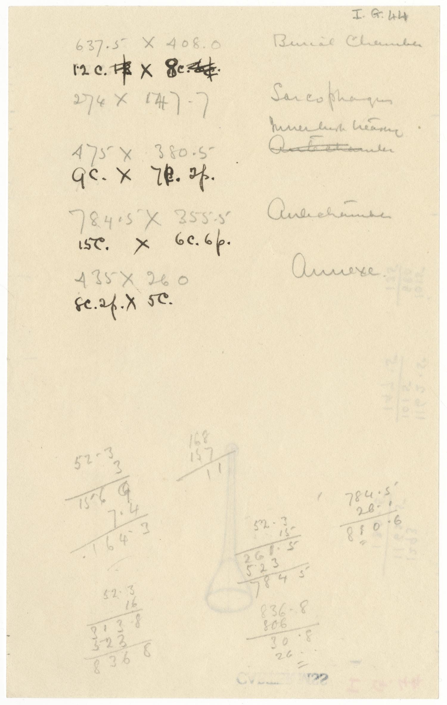 Notes with measurements and calculations for the sarcophagus, Burial chamber, Treasury, Antechamber and Annex