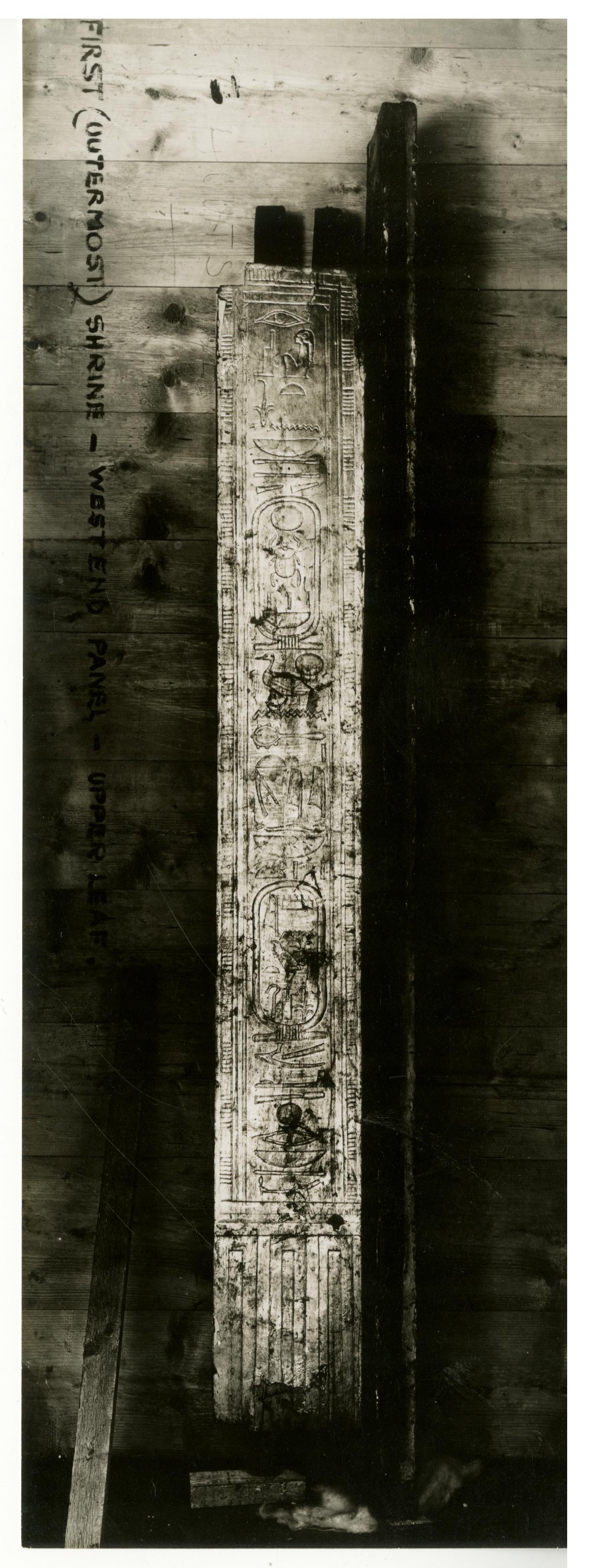 Photograph of the first sepulchral shrine (south-eastern corner-post) by Burton, taken in the Egyptian Museum in Cairo. Note by Carter in ink.