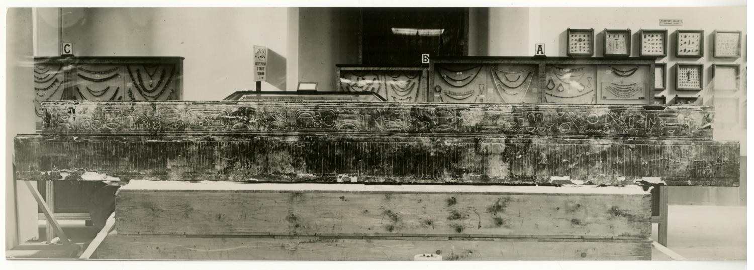 Photograph of the first sepulchral shrine (interior, south frieze) by Burton, taken in the Egyptian Museum in Cairo. On verso handwritten note, possibly made by Penelope Fox: "1st shrine, frieze, S. side, interior".