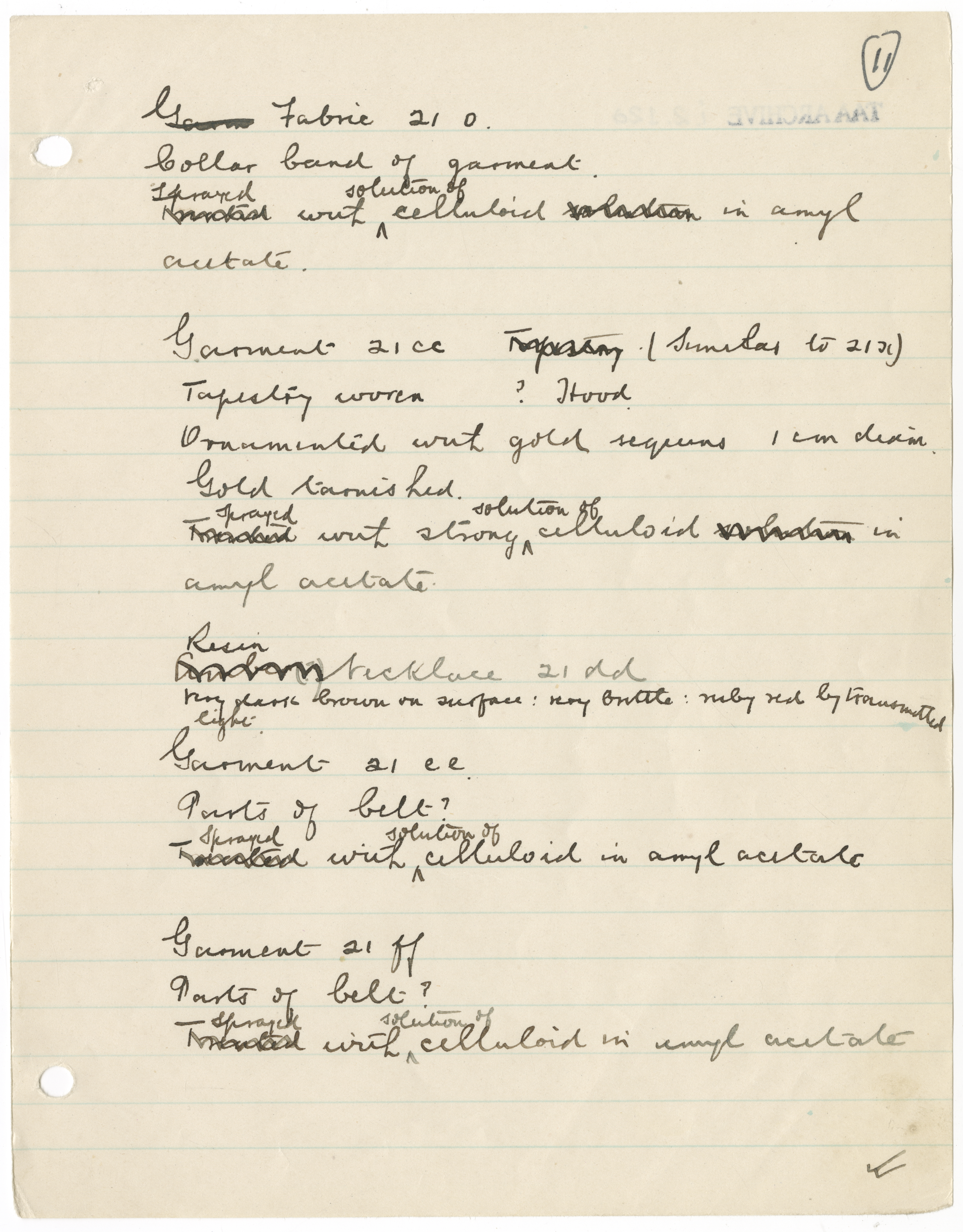 Collar band of garment.Treated/<Sprayed> with <solution of> celluloid solution in amyl