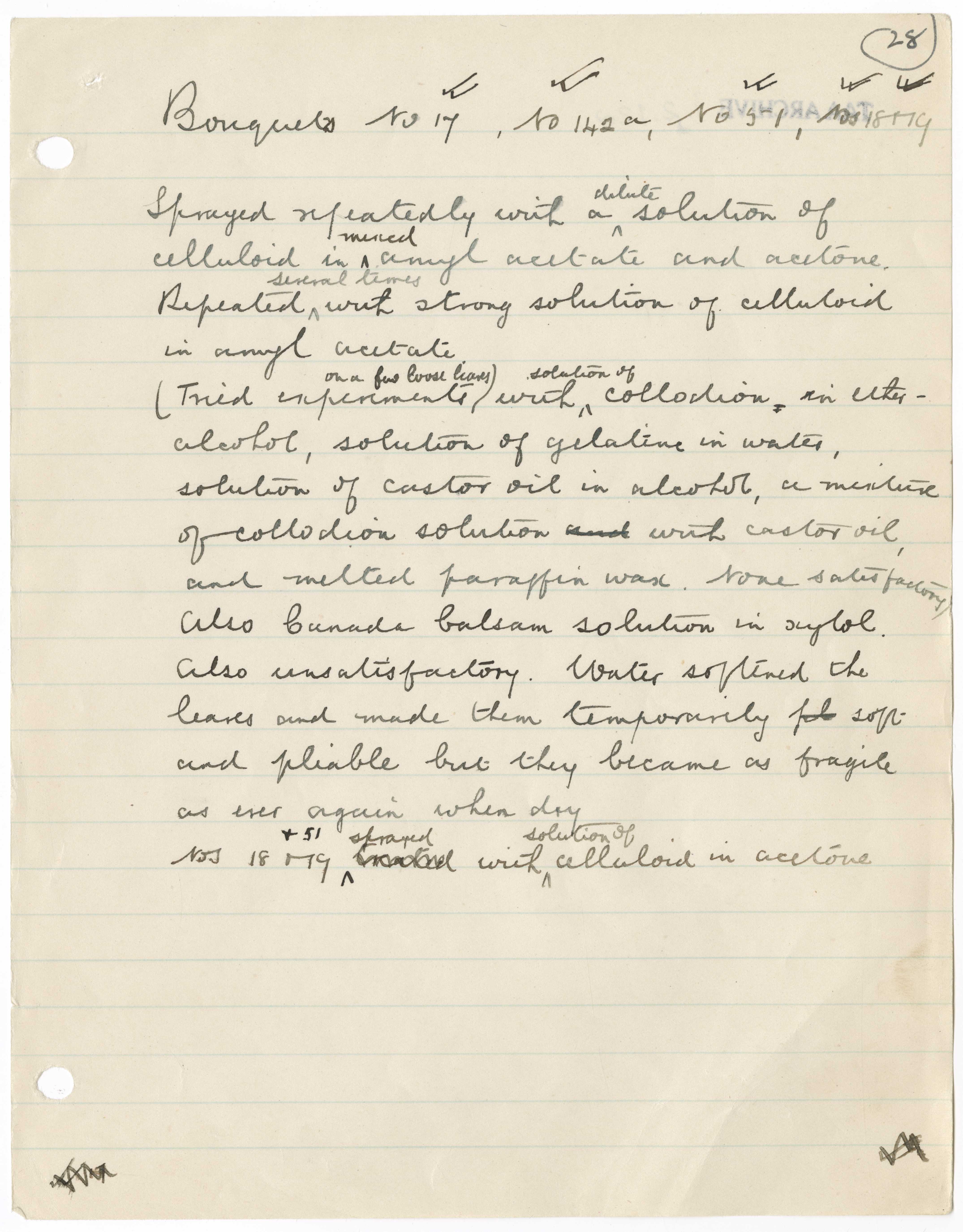 (Tried experiments <on a few loose leaves>) with <solution of> collodion, in ether –