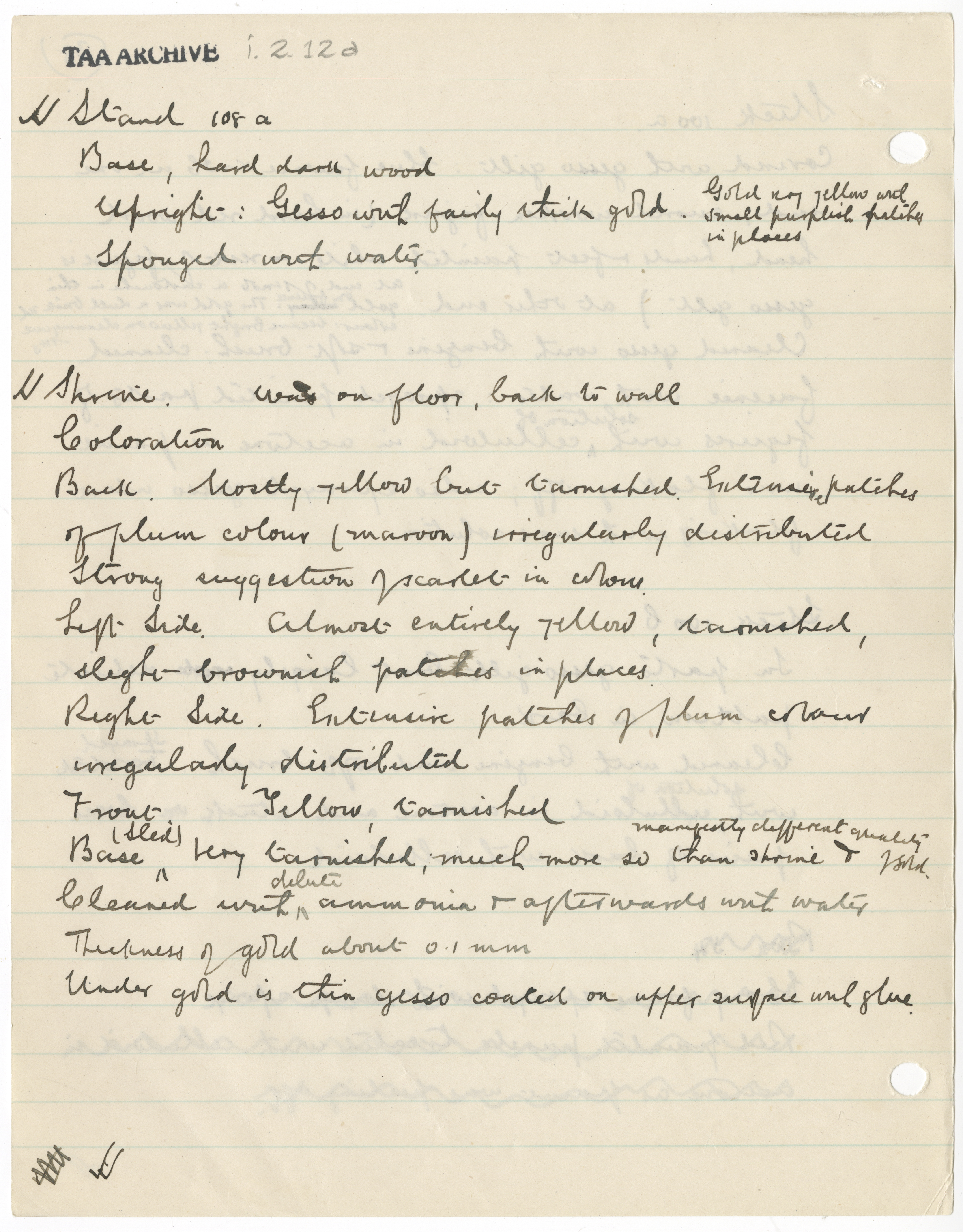 Upright: Gesso with fairly thick gold. Gold very yellow with