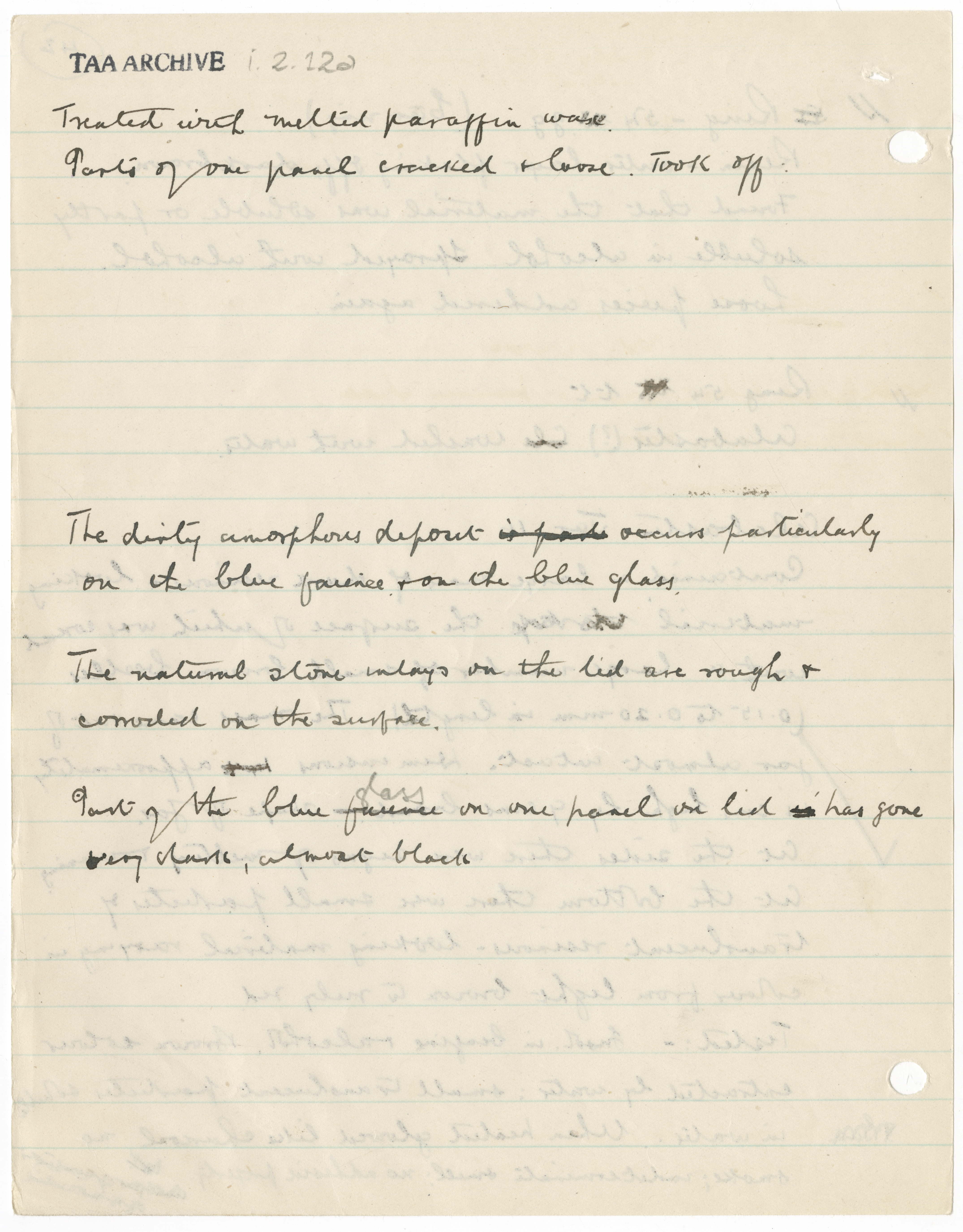 Part of the blue faience/<glass> on one panel on lid is has gone