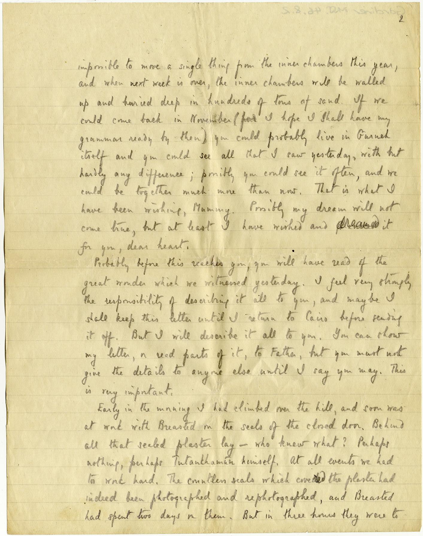 Letter from Sir Alan H. Gardiner to his wife including his account of the opening of the burial chamber of Tutankhamun on February 16, 1923, page 2.