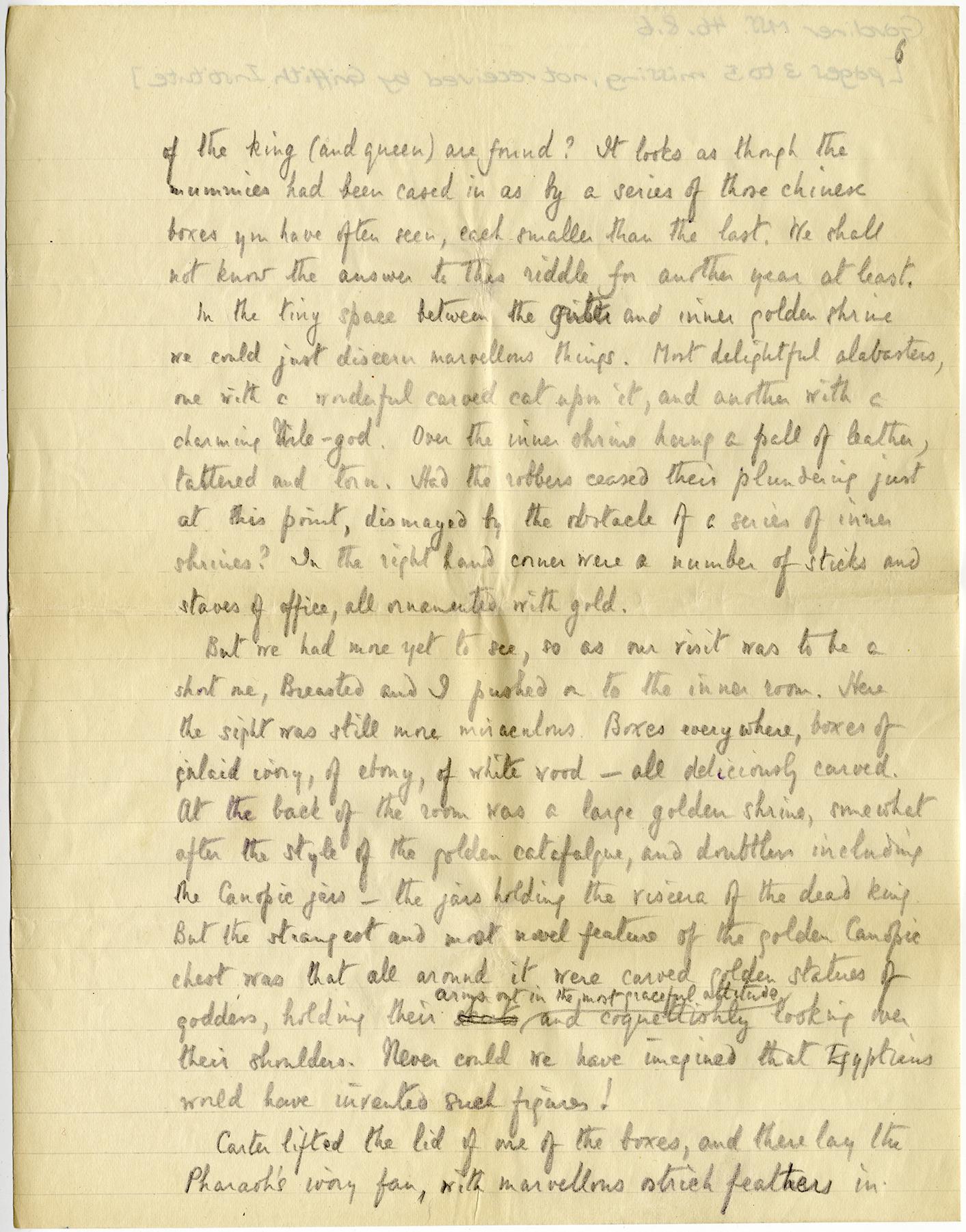 Letter from Sir Alan H. Gardiner to his wife including his account of the opening of the burial chamber of Tutankhamun on February 16, 1923, page 6.