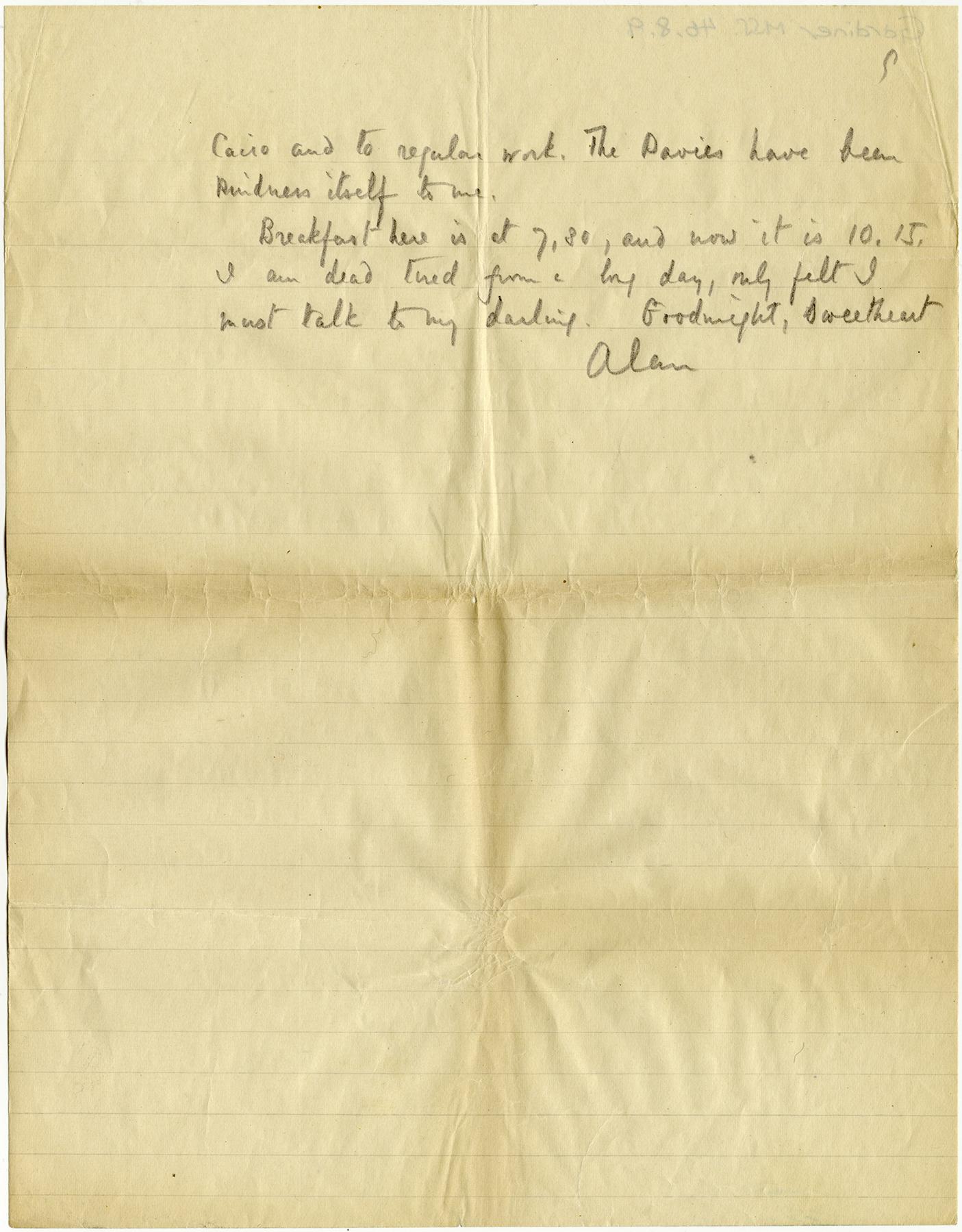 Letter from Sir Alan H. Gardiner to his wife including his account of the opening of the burial chamber of Tutankhamun on February 16, 1923, page 9. Also includes part of another entry dated 23 February 1923.