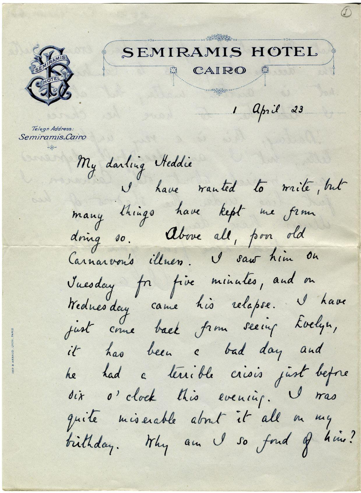 Letter from Sir Alan H. Gardiner to his wife regarding the health of Lord Carnarvon, page 1.