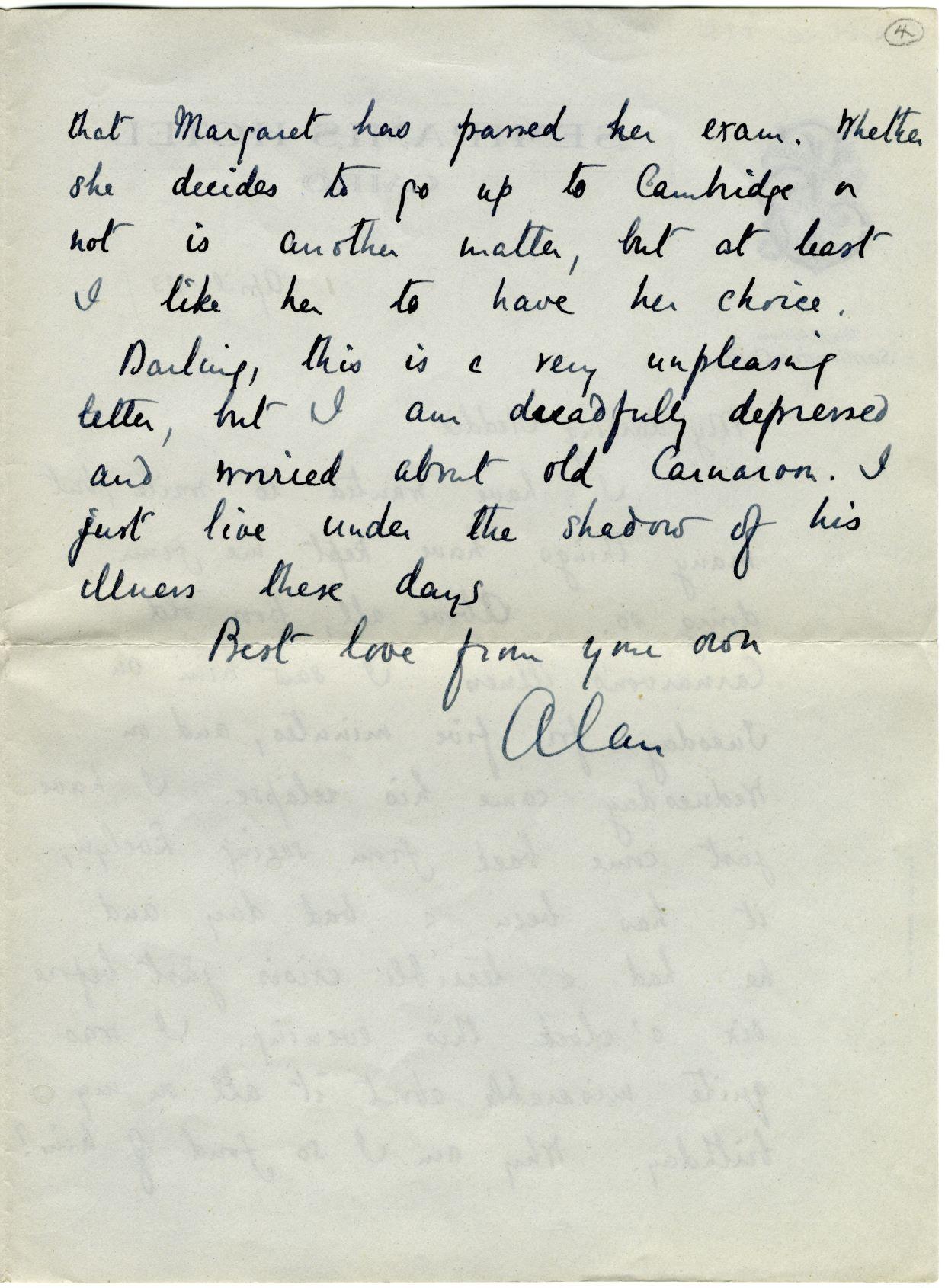 Letter from Sir Alan H. Gardiner to his wife regarding the health of Lord Carnarvon, page 4.