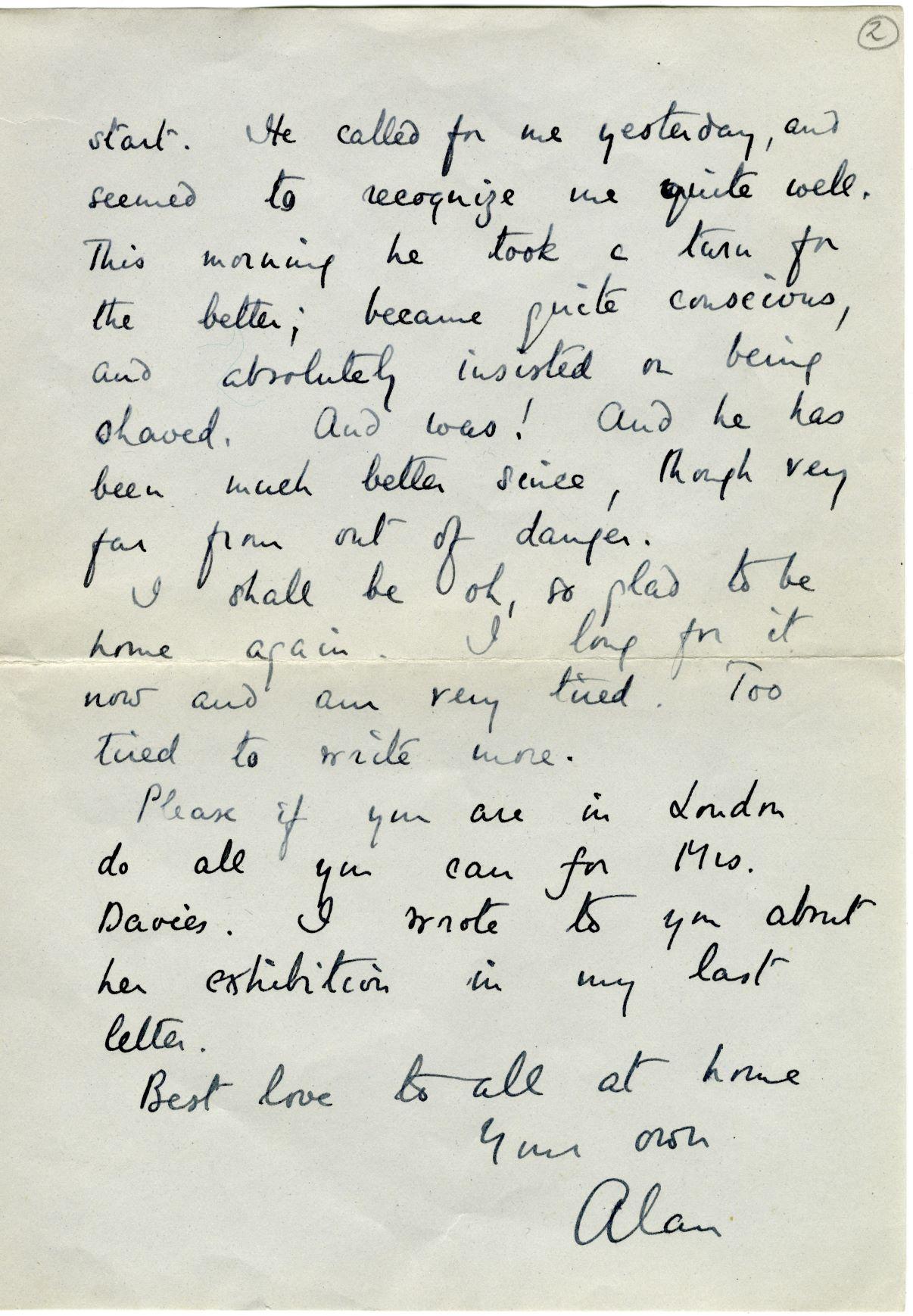 Letter from Sir Alan H. Gardiner to his wife regarding the health of Lord Carnarvon, page 2.