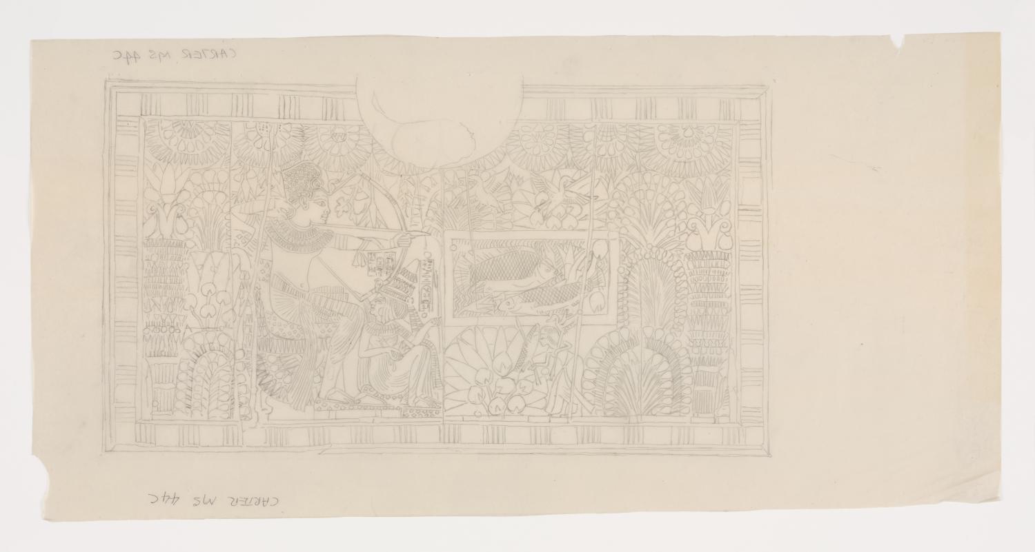 Tracing of a scene with Tutankhamun seated on a chair holding an armed bow shooting fish and fowl, with Ankhesenamun squatting on a cushion at king's feet, on a panel from the front of box (no. 551)