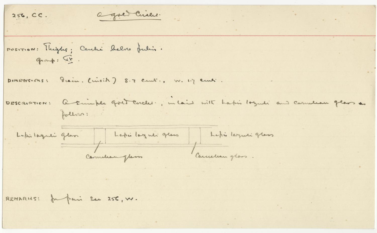 A simple gold circlet, inlaid with lapis lazuli and carneleansic glass as follows: