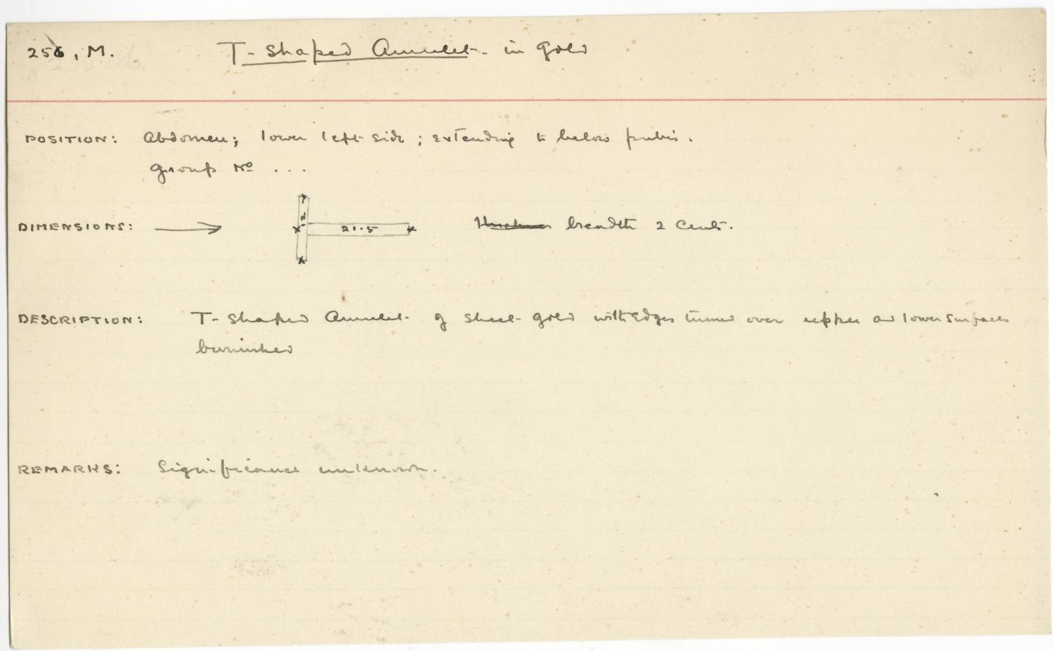 T-shaped amulet of sheet gold with edges turned over upper and lower surfaces