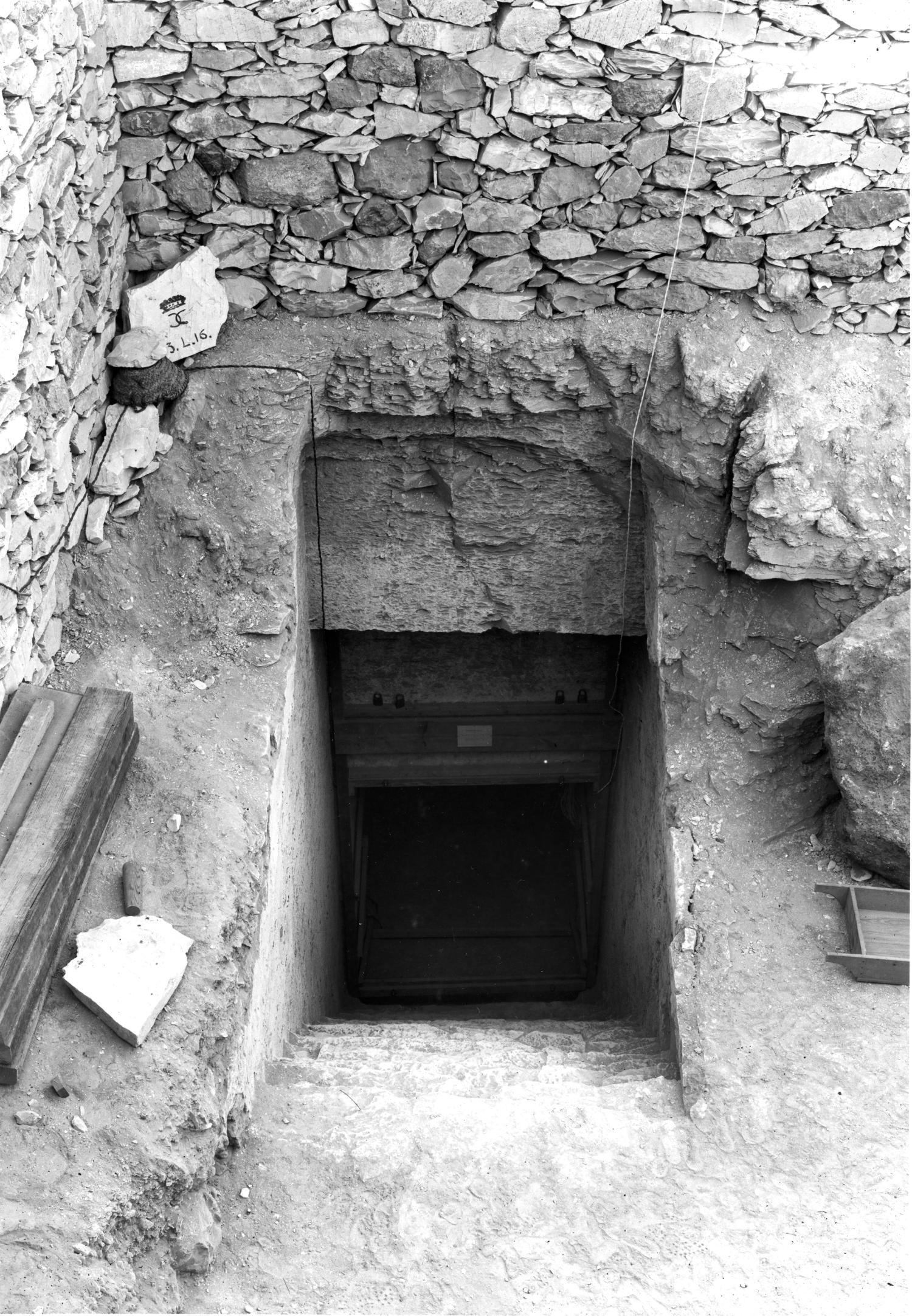 Rock-cut descent of 16 steps leading into the tomb; the top steps and door jambs had been cut away in antiquity to admit funerary furniture and later rebuilt in stone and plaster before final sealing. Objects discovered there are Carter objects 1 to 3.