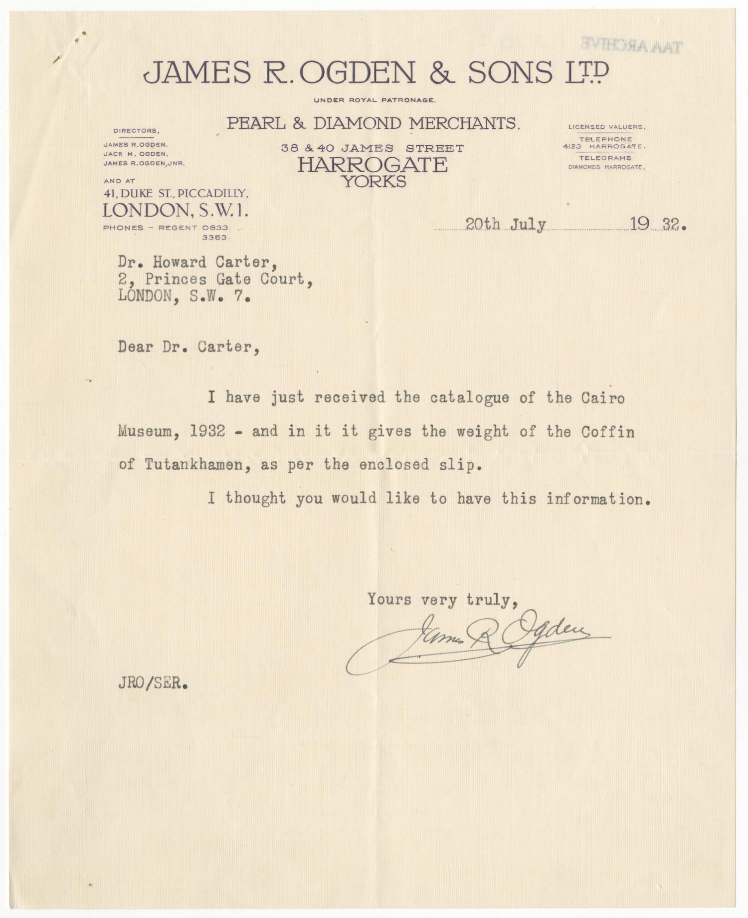 Typescript letter (with enclosed note TAA i.3.10.2) from James R. Ogden to Howard Carter on the third (innermost) coffin of gold.